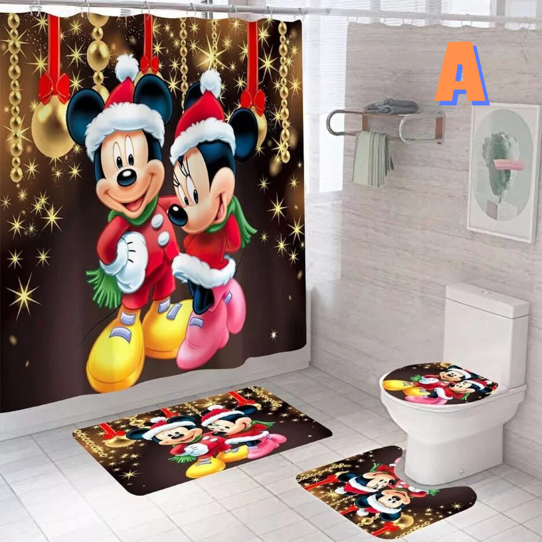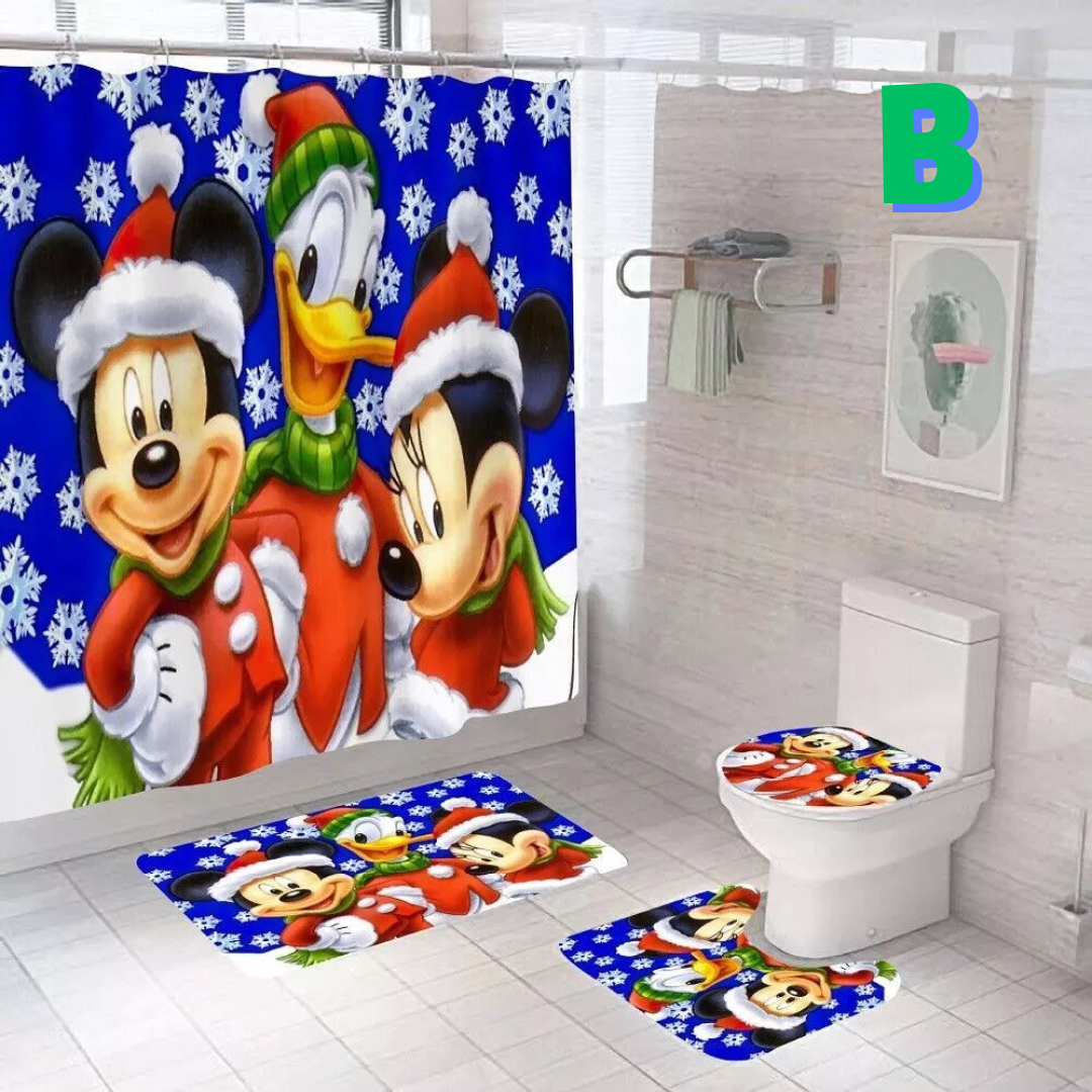 Celebrate the joy and wonder of Christmas with our Disney Christmas Shower Curtain! Featuring your favorite Disney characters in festive holiday designs, this shower curtain brings a touch of magic, warmth, and nostalgia to your bathroom. Choose from three enchanting designs: Mickey and Minnie in Santa outfits under sparkling golden Christmas decorations, Mickey, Minnie, and Donald in Santa suits with cozy green scarves, or Mickey and Minnie enjoying a snowy winter wonderland in their holiday attire. For a complete holiday bathroom makeover, this set includes a shower curtain, a bathroom rug, a toilet U mat, and a toilet cover mat, all featuring the same charming Disney Christmas theme.